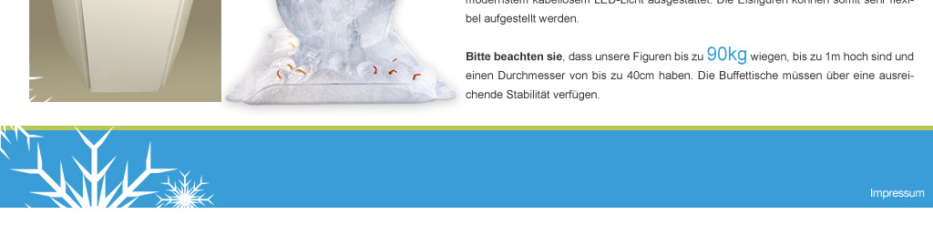 Eis-Skulpturen manufaktur CottbusUnsere Figuren werden in liebevoller Handarbeit für Sie hergestellt. Je nach Größe sind die Figuren nach bis zu 72 Stunden vollständig gefrohren. Unsere Skulpturen bestehen aus speziell aufbereitetem Trinkwasser. Es ist nicht zum Trinken geeignet, aber keines Falls gesundheitsschädlich. Somit ist es ohne weiteres möglich, die Skulpturen auf einem Buffet zu verwenden.Wir stellen Ihnen alles Nötige für das Aufstellen einer Skulptur zur Verfügung. Sie erhalten leihweise eine formschöne Tropfwasserauffangschale (inklusive Abfluss), eine Vorrichtung zur effektvollen Beleuchtung oder passende freistehende Ständer mit einem integriertem unsichtbaren Tropfwasserauffangbehälter. Die Beleuchtungselemente sind mit modernstem kabellosem LED-Licht ausgestattet. Die Eisfiguren können somit sehr flexibel aufgestellt werden.  Bitte beachten sie, dass unsere Figuren bis zu 90kg wiegen, bis zu 1m hoch sind und einen Durchmesser von bis zu 40cm haben. Die Buffettische müssen über eine ausreichende Stabilität verfügen.